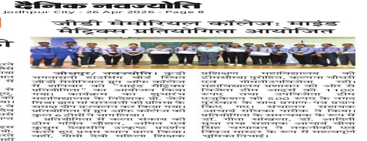 The G.D.Memorial college aims to acquire the leadership position in the field of Technology, Management & Humanities education in Country . Since its establishment , the institute has focused on developing leaders in various domains. Our vision is to emerge as a top ranking institute in India and our aim is to achieve good recognition as a leading player in the field of higher education. The institute offers graduate & post graduate degree programs in Science, Information Technology, Management & Arts domains. The co-curricular, extra-curricular & intense learning environment fosters the development of a holistic personality. We would like to reaffirm the full commitment of the institute to make it a world class platform of Teaching, Learning & Research activities. The institute has recently taken various innovative steps to encourage & enrich the students so that they are trained in competitive & realistic environment which develops their practical & applied approach. The passing out batch of students have been groomed to posses excellent personality, outstanding intellect & capacity to work as team player. They would prove to be assets to any organization. ...