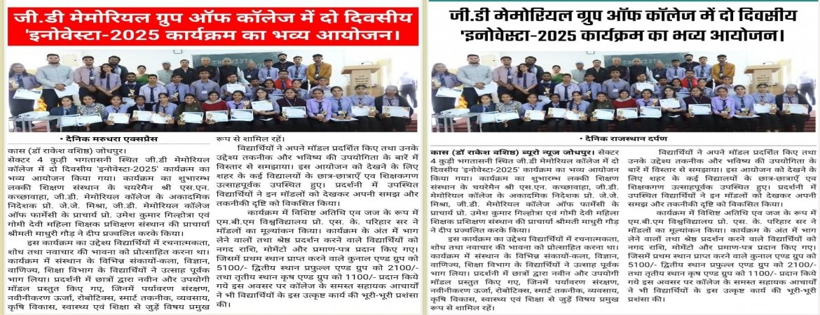 A grand two-day Innovesta-2025 program was organized at G.D Memorial College, Sector 4, Kudi Bhagats...